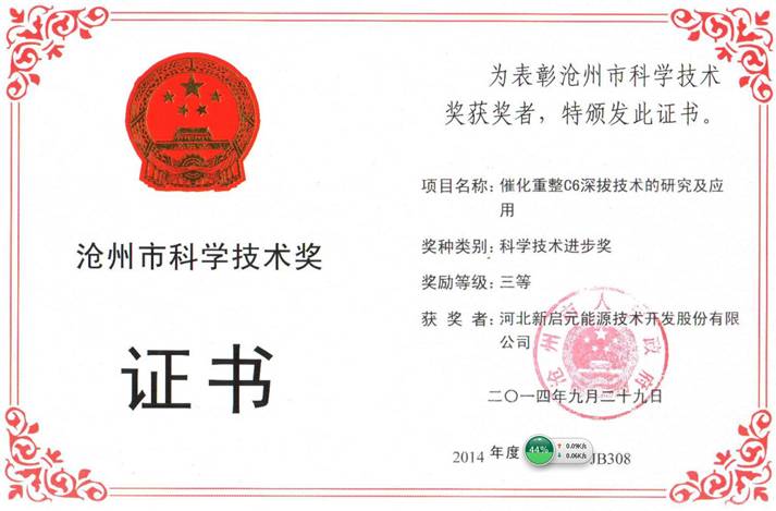 2014年10月13日河北新啟元能源技術(shù)開發(fā)股份有限公司獲得滄州市科學(xué)技術(shù)獎三等獎,獲獎項目為《催化重整C6深拔技術(shù)的研究及應(yīng)用》。項目主要完成人李志剛、喬樹華、劉海軍、劉立新、鄭擁軍。