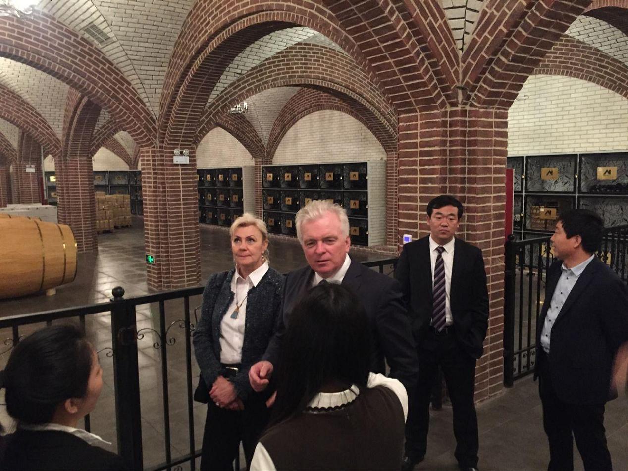 杜尚?貝拉大使及夫人與中捷政府領(lǐng)導(dǎo)參觀了酒莊釀酒堡、地下酒窖,總經(jīng)理張鵬詳細(xì)介紹了酒莊發(fā)展規(guī)劃、經(jīng)營情況及中斯之間的友好合作。