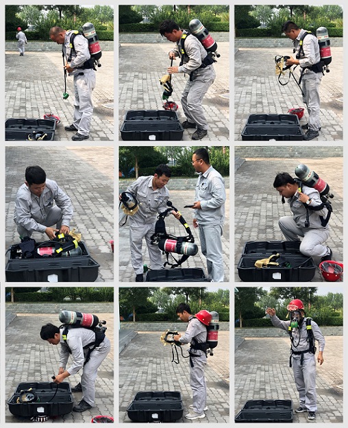 第四周為“應急器材技能比武”活動周。此次比武的內(nèi)容是“空氣呼吸器穿戴”。該項目重點檢驗員工對空氣佩戴裝置、氣瓶壓力、報警閥、面罩以及呼吸閥的檢查,對呼吸器佩戴操作的熟練性和連貫性等。參賽選手緊抓比賽要點,梳理檢查、佩戴、調(diào)整、確認四個操作環(huán)節(jié)。比賽期間,參賽選手們不時對佩戴技巧和要點難點進行交流,共同探討如何提升技能。