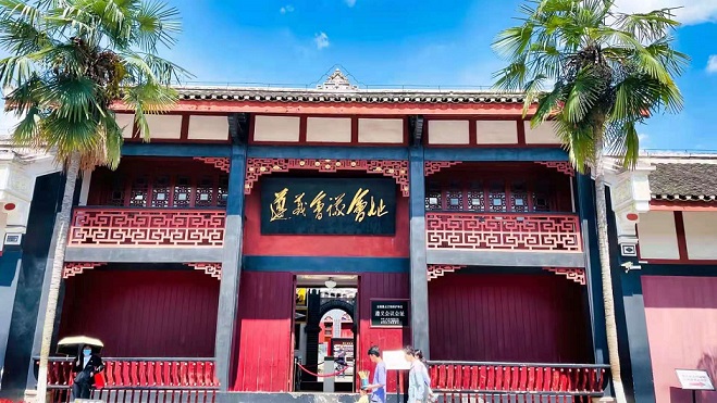 駐足遵義會議紀念館,首先映入大家眼簾的是紀念館門前大門正上方掛著的一塊黑漆金匾,上面有毛主席親自題寫的“遵義會議會址”6個金光閃閃的大字,字跡飄逸豪放。遵義會議紀念館的展廳內展示了大量文物、珍貴歷史圖片、文獻資料等,生動地再現了紅軍長征的歷程?!伴L征精神誨育千秋,遵義會議永放光芒。”遵義會議集中體現了堅定信念、實事求是、獨立自主、敢創(chuàng)新路、民主團結的精神。